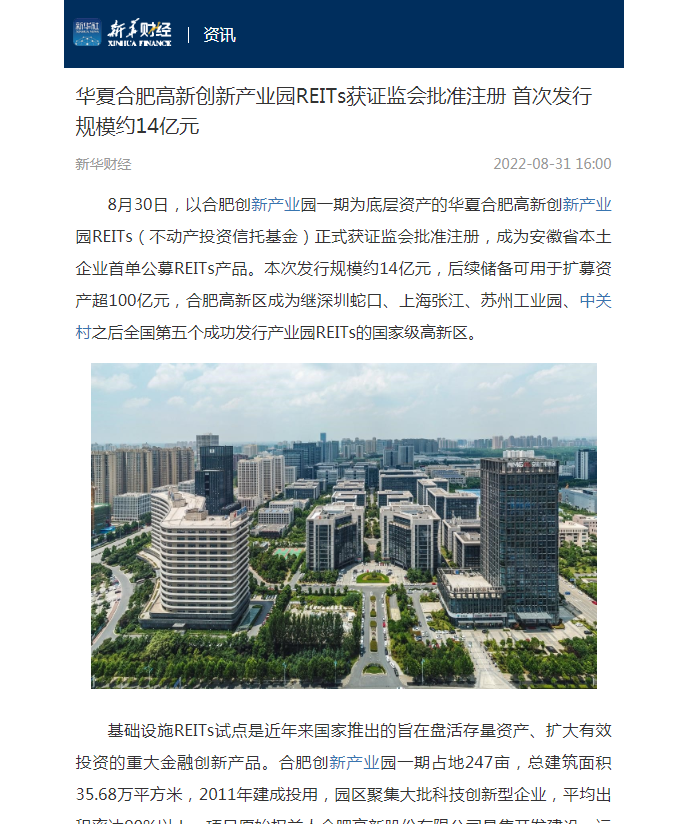 8月30日,以合肥创新产业园一期为底层资产的华夏合肥高新创新产业园REITs(不动产投资信托基金)正式获证监会批准注册,成为安徽省本土企业首单公募REITs产品。本次发行规模约14亿元,后续储备可用于扩募资产超100亿元,合肥高新区成为继深圳蛇口、上海张江、苏州工业园、中关村之后全国第五个成功发行产业园REITs的国家级高新区。