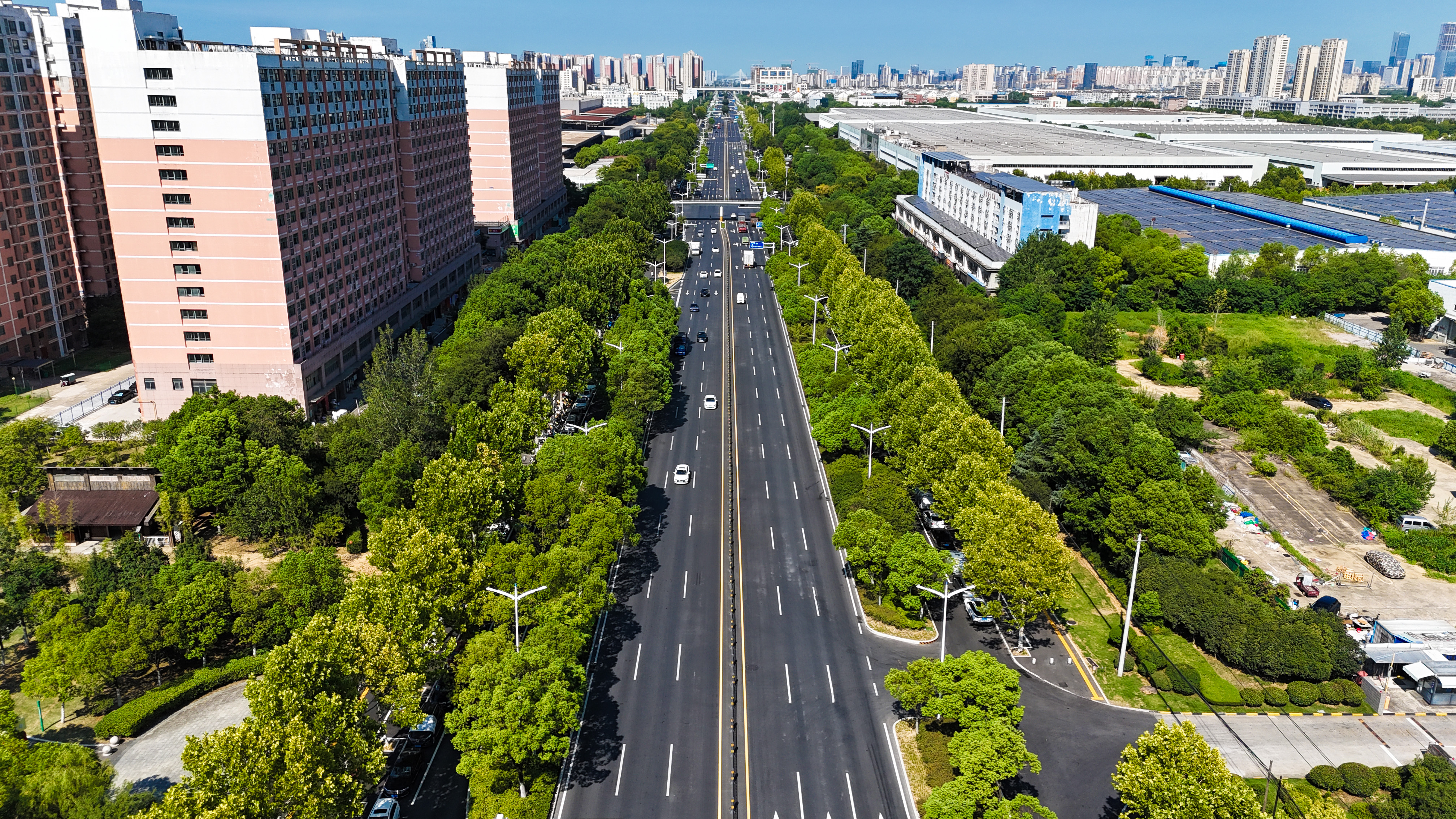 作为高新区南部重要的东西向城市主干道,此次改造针对不同路段现状特点,实施差异化方案。其中,明珠大道(杭埠路-集贤路)段原已具备“双六主车道+辅道+人行道”格局,本次以“白加黑”(水泥路面升级沥青路面)为主,进一步提升道路通行舒适度与耐用性;明珠大道(玉兰大道-大龙山路)段原为“双四主车道”,辅道与人行道尚未完善,本次改造不仅将主车道升级为“双六”标准,还同步新建辅道与人行道,补齐慢行短板;明珠大道(大龙山路-鸡鸣山路)段原已具备“双六主车道”,但慢行系统不完善,此次改造重点新建辅道和人行道,完善道路功能。