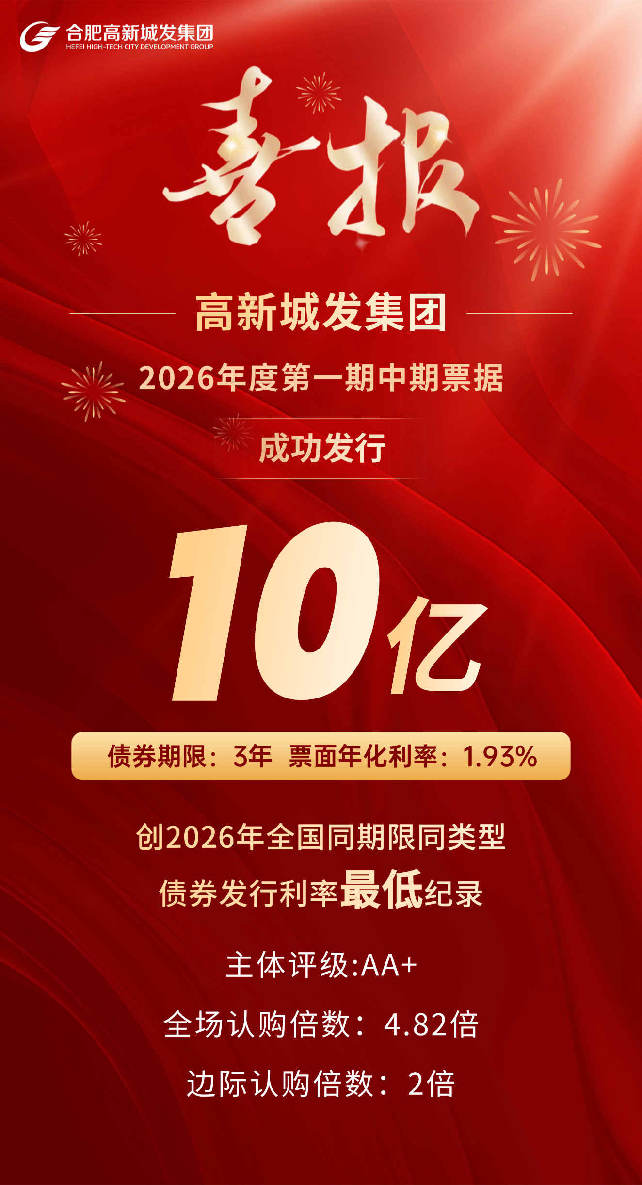 1月19日,高新城发集团成功发行2026年度第一期中期票据,发行规模10亿元,期限3年,票面利率1.93%,全场认购倍数4.82倍,边际认购倍数2倍,创2026年全国同期、同类型债券发行利率最低纪录。